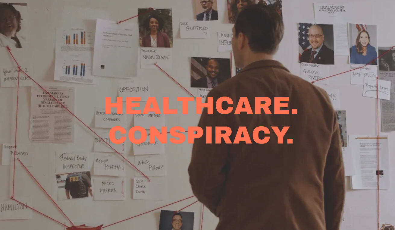 HEALTHCARE CONSPIRACY; Watch this 22-minute mockumentary about two intrepid reporters blowing the lid off a wild conspiracy involving multiple industries and governments siphoning billions of dollars from the public who are suffering both physically and financially … that everyone already knows about: the healthcare industry. You will learn about the NY Health Act!!!